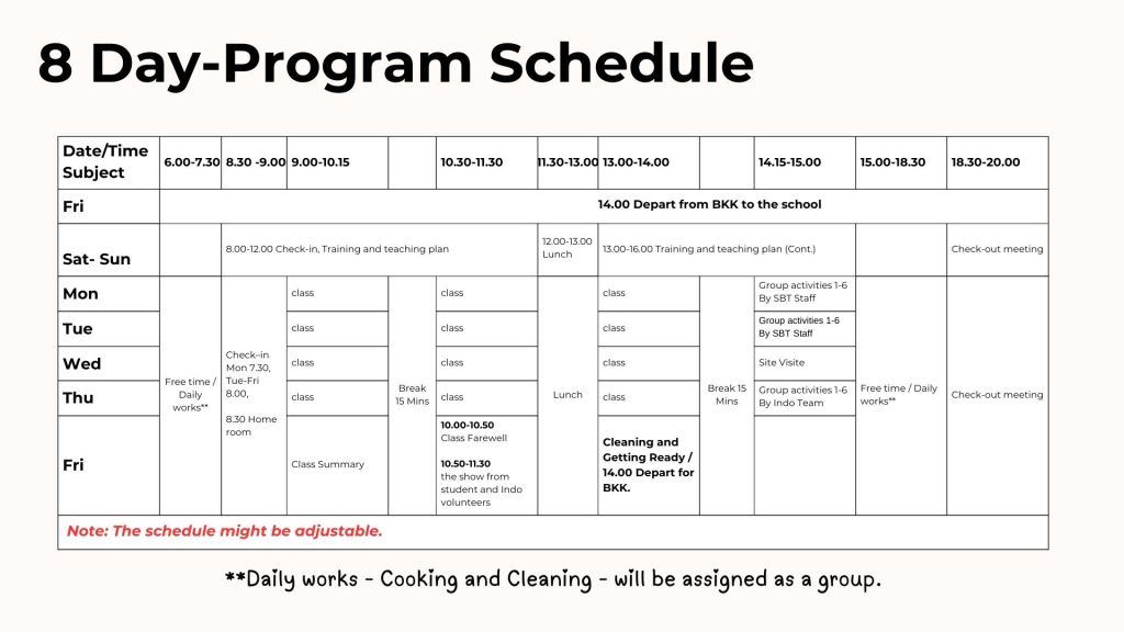 - เวรครัวและเวรทำความสะอาดจะจัดสลับไปมา โดยเฉลี่ยแต่ละกลุ่มจะได้ทำครัว 2 ครั้ง ทำความสะอาด 2 ครั้ง